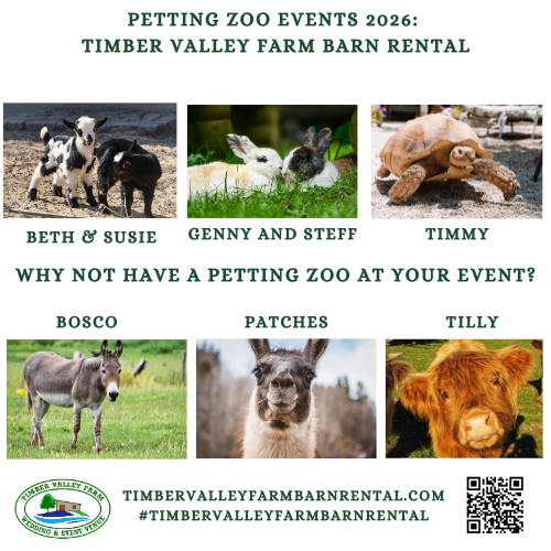 - Contact Tom and Karen Grosh at https://timbervalleyfarmbarnrental.com/contact/ at Timber Valley Farm Barn Rental to schedule your live petting zoo for your event.